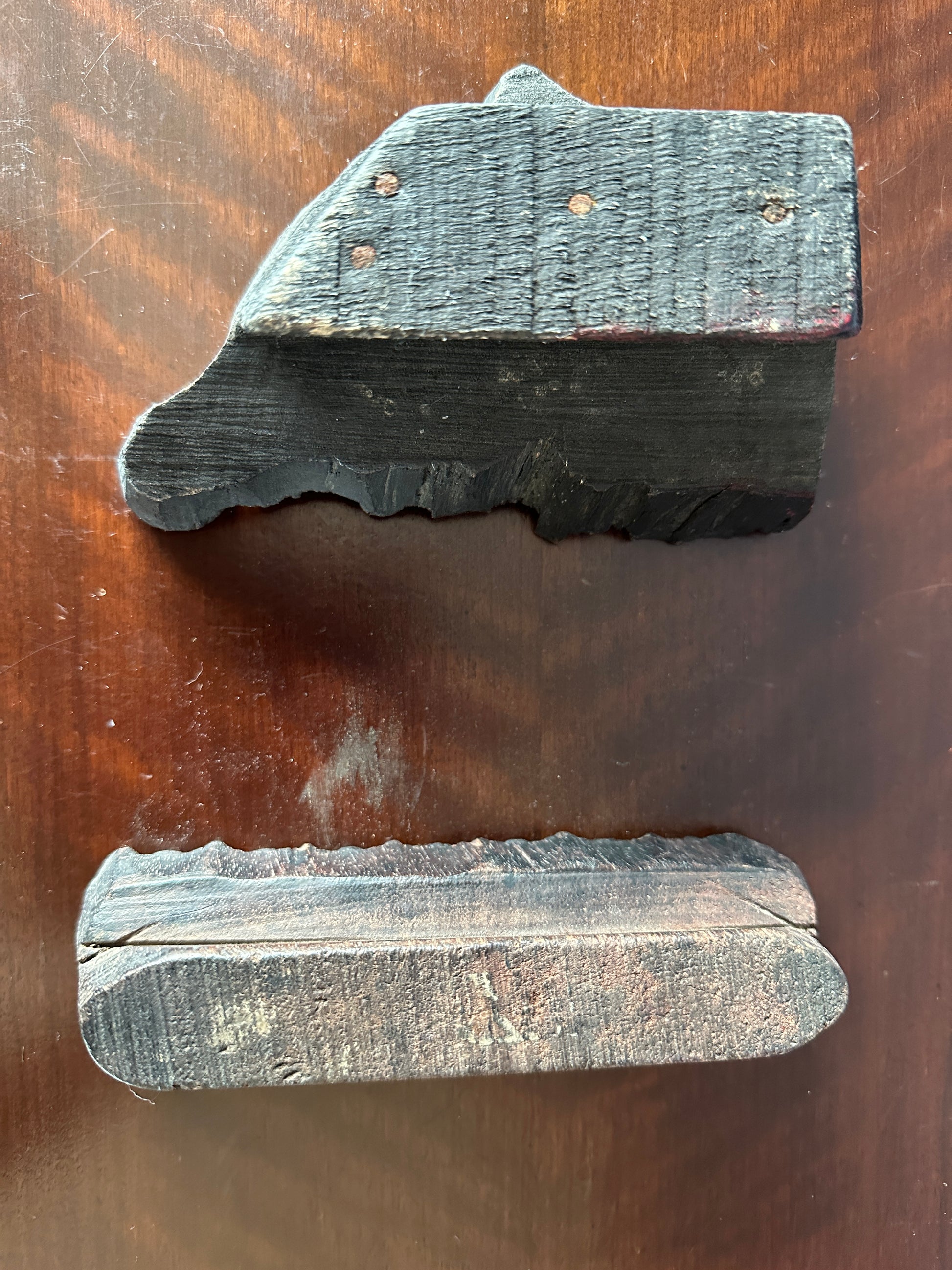 From the days when DIY was really DIY! These two hand-carved wooden stamps would have been used for textiles or wallpaper.