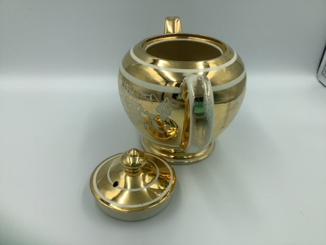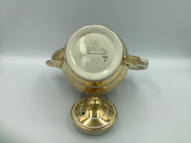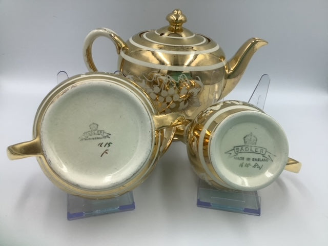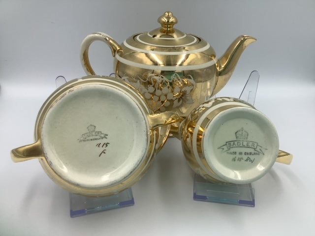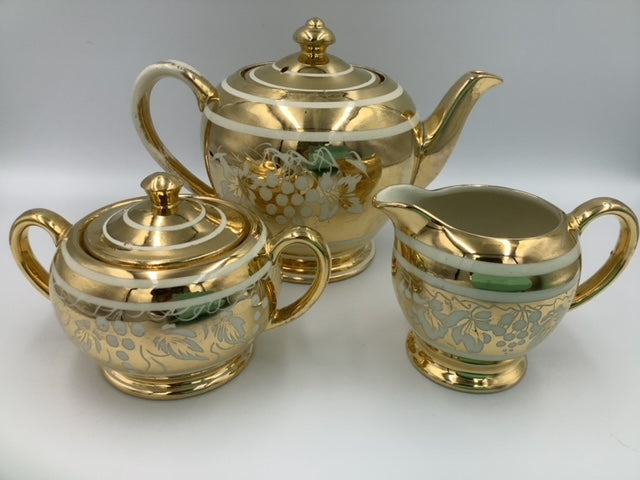 A lovely vintage gold and cream Sadler teapot, creamer, and lidded sugar bowl set with grape motif.