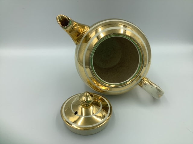 Condition: This is a used vintage set. The teapot has visible wear to the gold trim on the handle (see photo) and inside lip where the lid meets the pot, and crazing and tannin staining prominent throughout the interior. The creamer and sugar bowl are in excellent condition with minor crazing on the cream bands of the sugar bowl. No chips or cracks on any of the pieces.