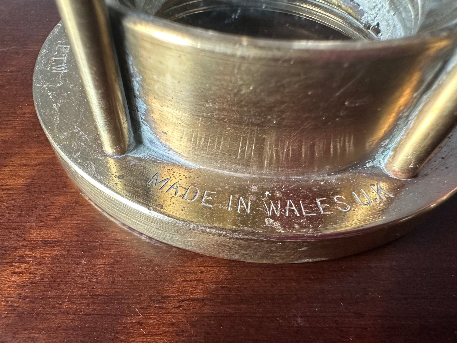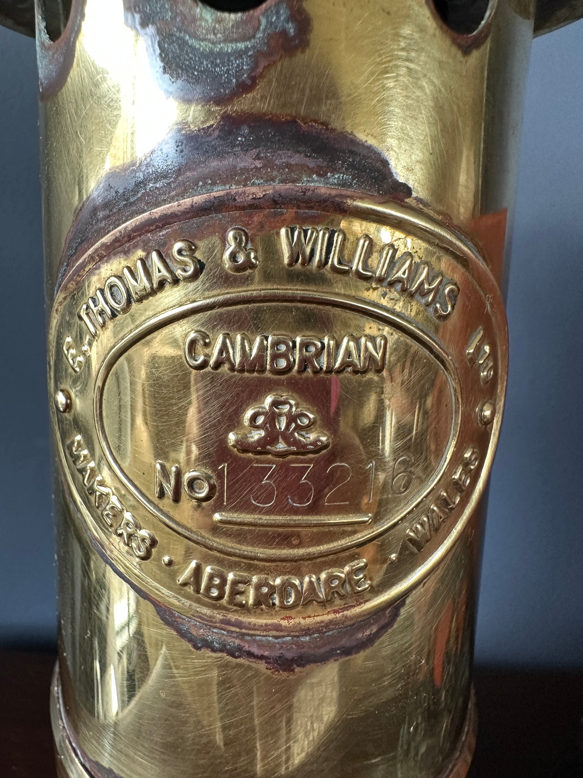 The plate on the front of the lamp hood is marked E. Thomas & Williams Ltd, Makers Aberdare Wales, Cambrian, No. 133216. The glass insert is unmarked. The base of the lamp is marked E.T.W., Made in Wales, UK, 1984, and the company trademark.