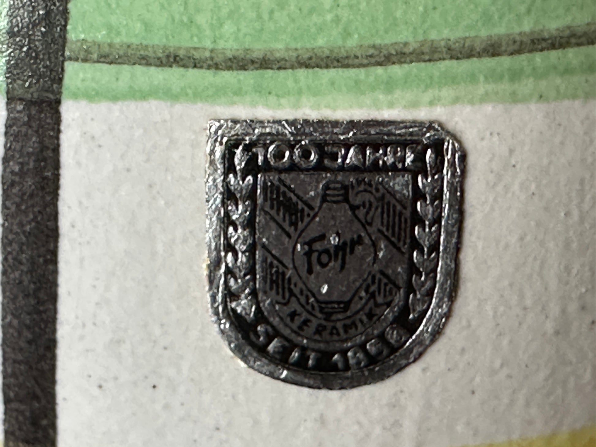 The bottom of the vase is stamped "Made in Germany. 331-9". The foil sticker label reads "Fohr Keramik, 100 Jahre, Seit 1858". This sticker was used during the 100th anniversary of the company.