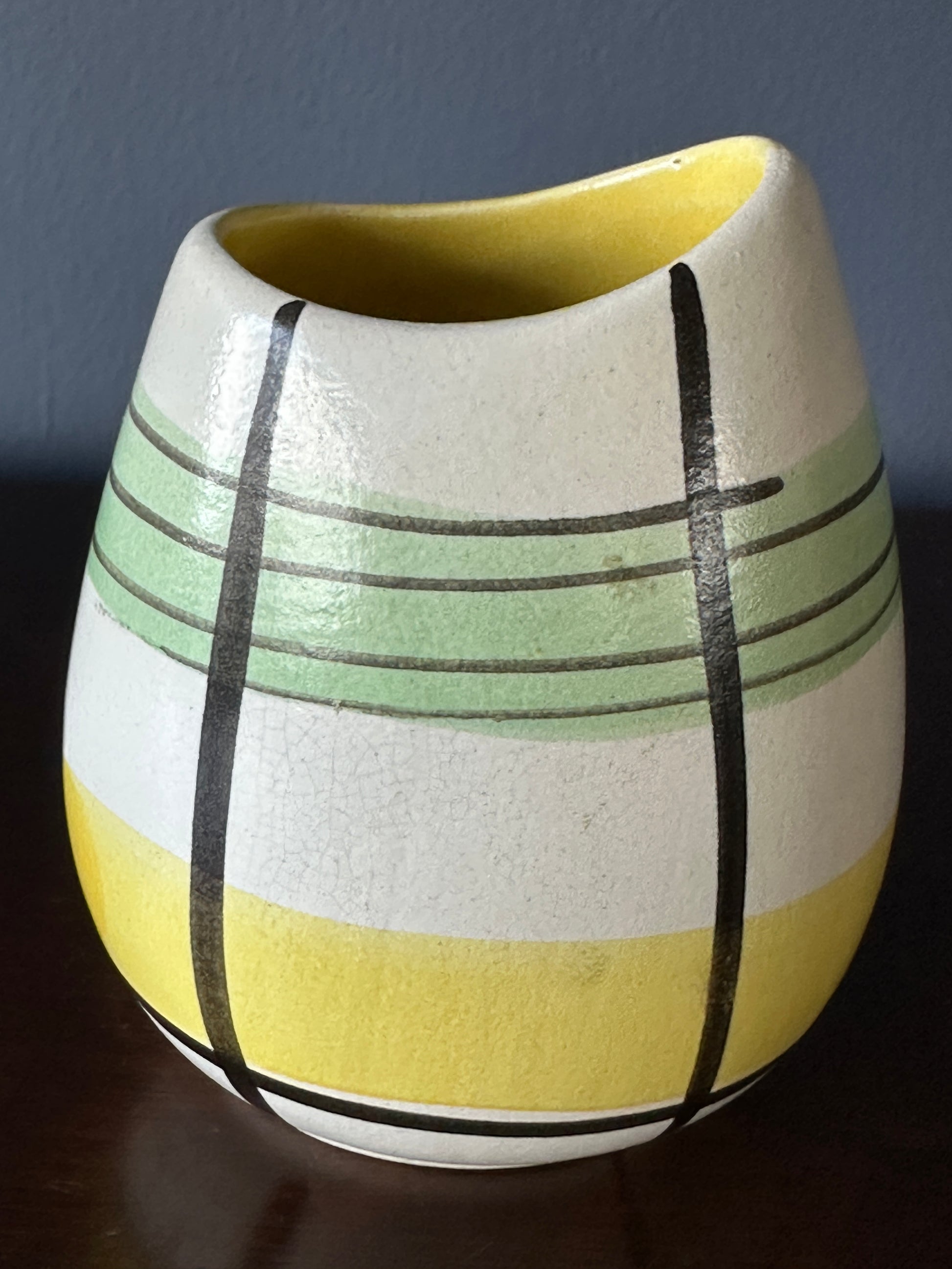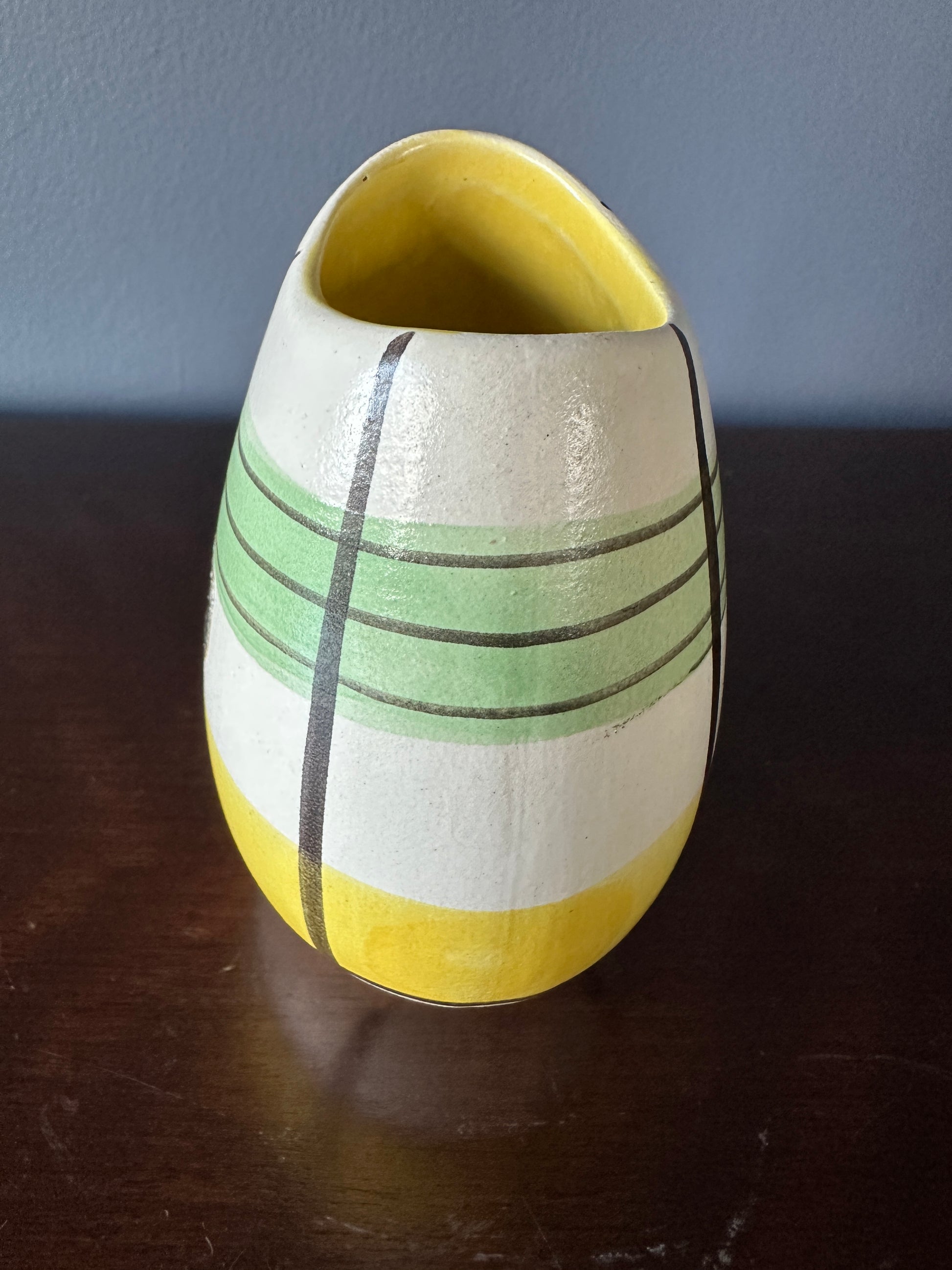 The vase features a cream background with green and yellow horizontal bands, intersected by bold black vertical lines, with a fish mouth top.