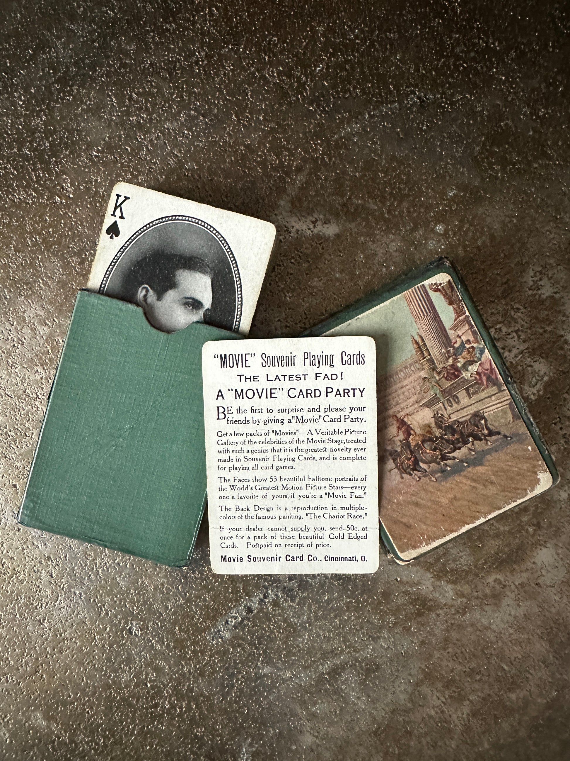 A boxed set of Movie Souvenir Playing Cards from 1916, this 52 card set features a different black and white portrait of a "motion picture" star on each card.