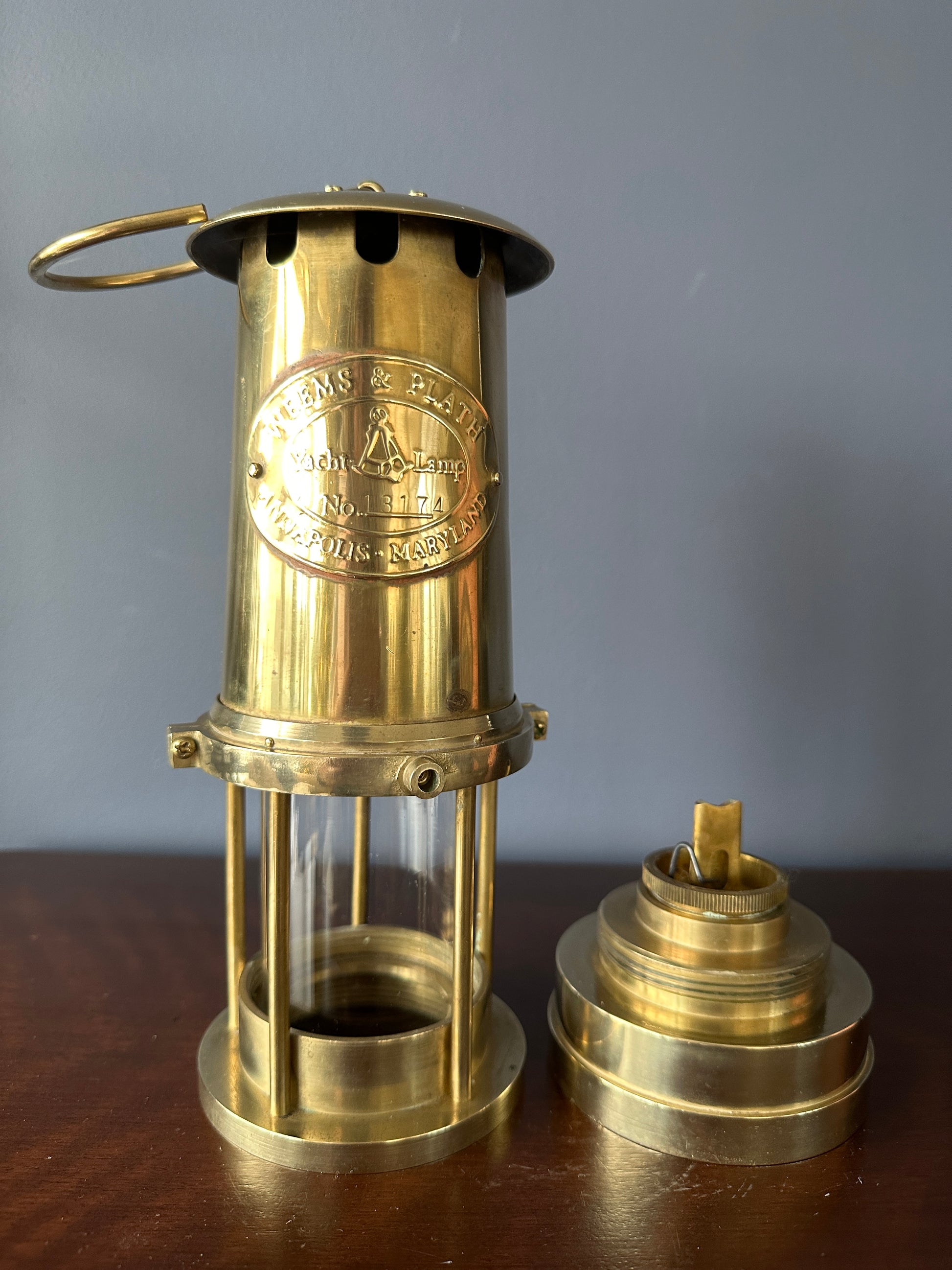 The plate on the front of the lamp hood is marked Weems & Plath, Yacht Lamp, No. 13174, Annapolis, Maryland. The glass insert is unmarked.